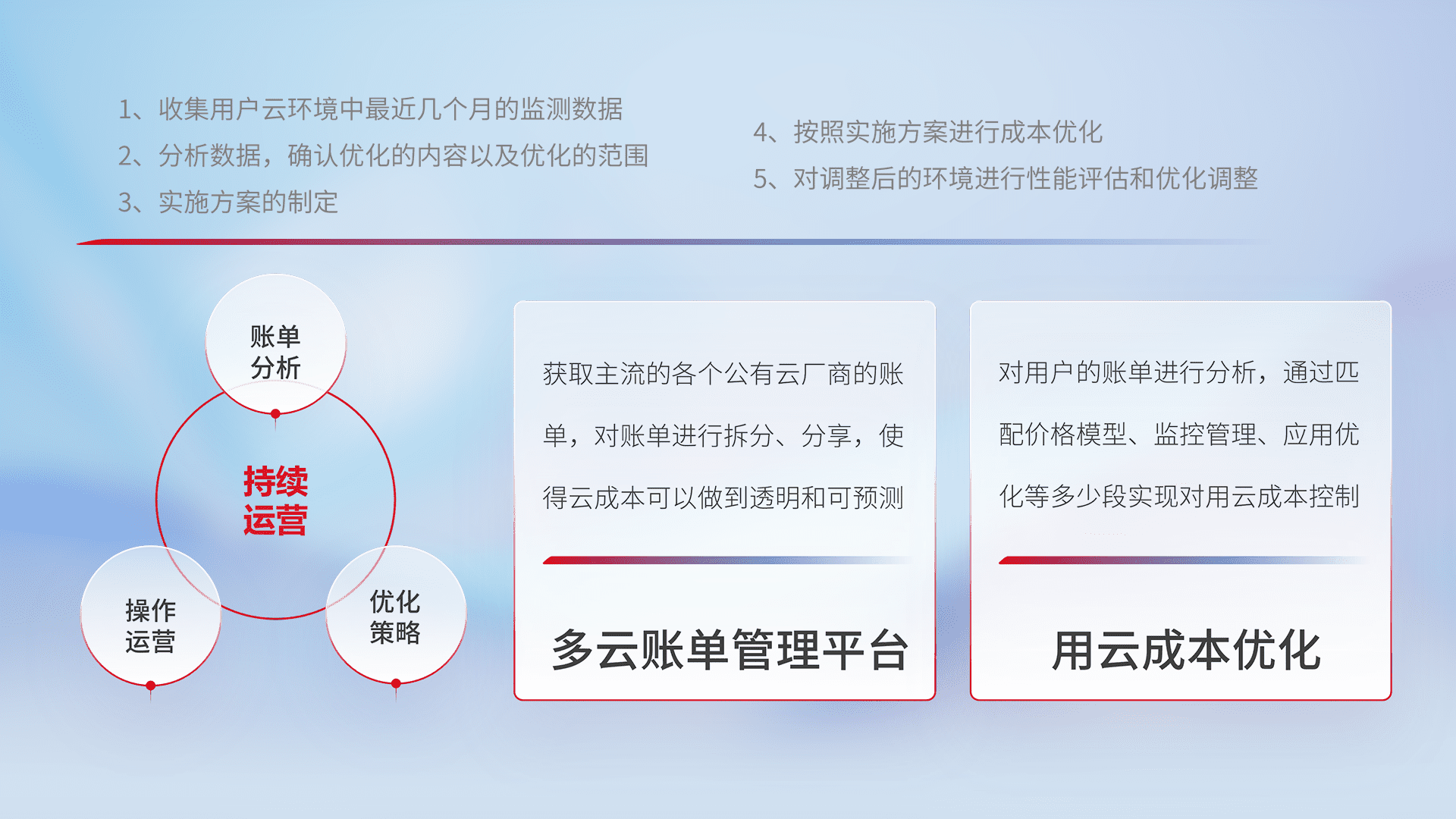 通过多云纳管,,,以统一的资源数据模型把客户的云资源进行抽象和封装,,进而实现对多云资源的统一操作,,,,保障云资源管理的可靠性、、稳定性与可用性。。量身定制化运维内容,,,配置、、、、开发运维、、、、补丁管理、、备份、、、监控、、、认证和访问管理、、、审计和日常巡检等,,保障在用云过程中的可靠度,,,,稳定度以及高可用率。。。