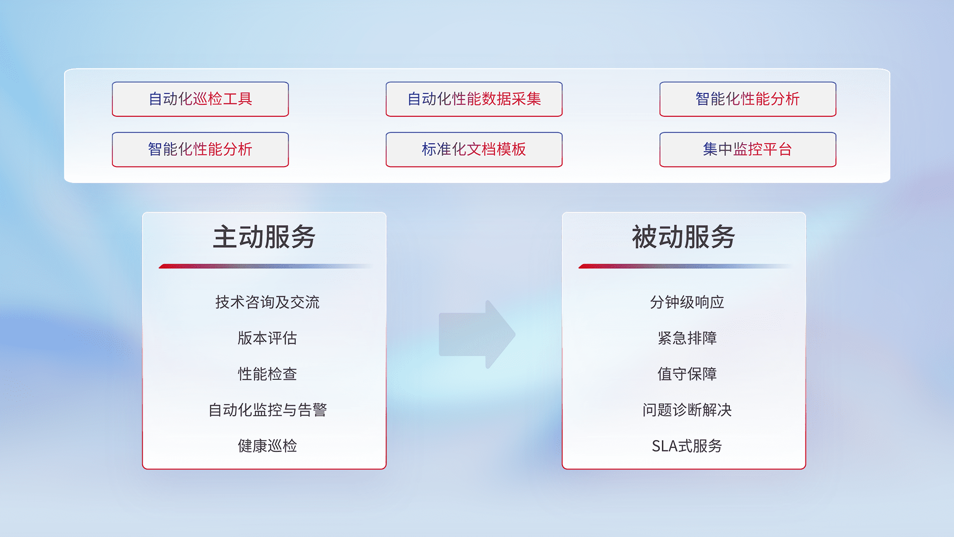 智能化工具和标准化文档,,,,保障服务质量,,,,提供主动服务(包含技术咨询、、、版本评估、、、性能检查、、、、自动化监控与告警、、、健康巡检)和被动服务包含(分钟级响应、、、、紧急排障、、值守保障、、、问题诊断解决、、SLA服务)。。。